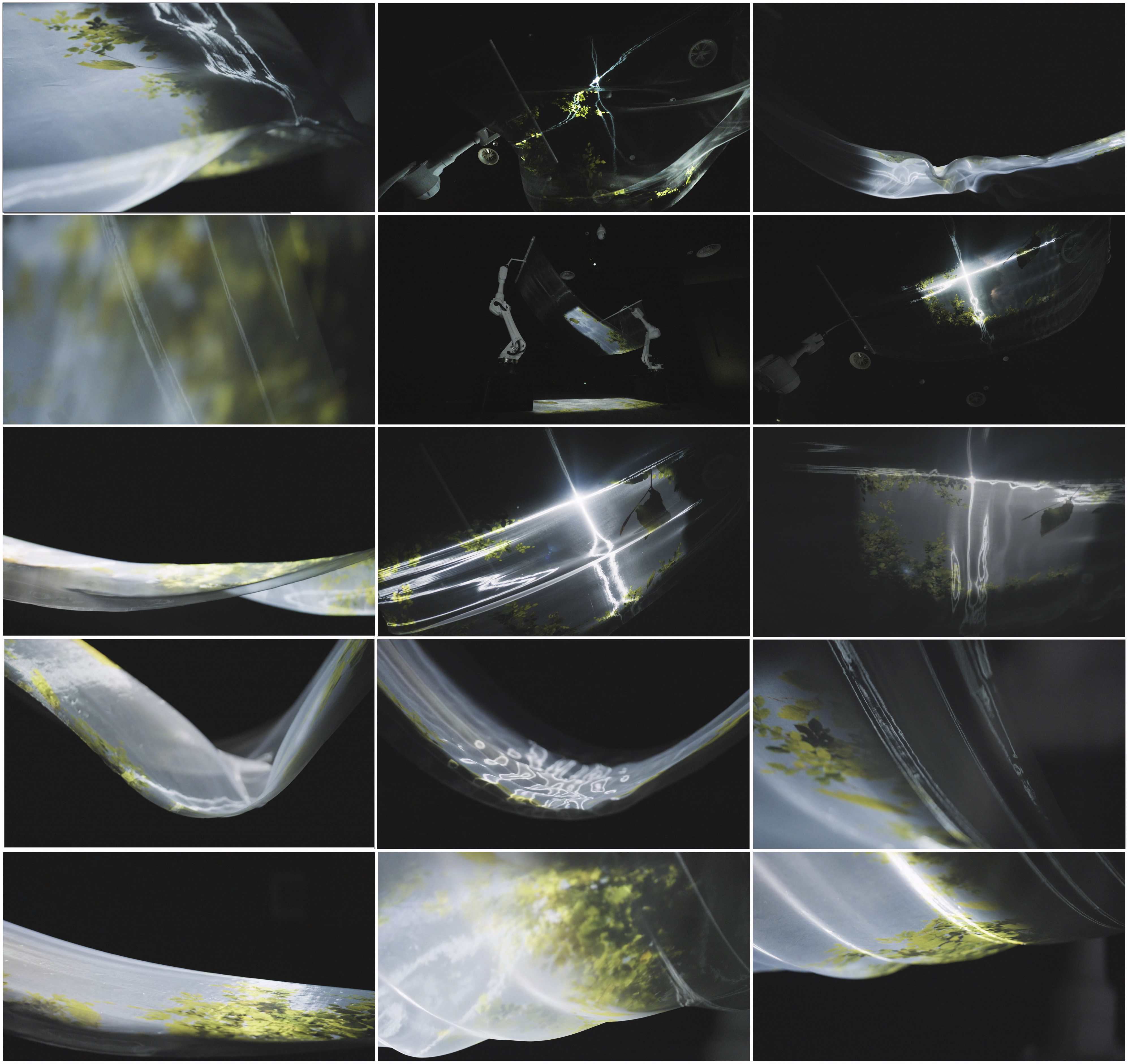 The setup is deceptively simple: two robotic arms face one another, holding opposite ends of a translucent veil. Their goal is to lift the sheet as high as possible. However, the feedback loop is strictly visual. A generative forest environment is projected onto the silk. As the fabric rises, the perspective climbs from the mossy forest floor, through the canopy, to the open sky. Height equals success, turning a complex optimization problem into a clear visual metric.