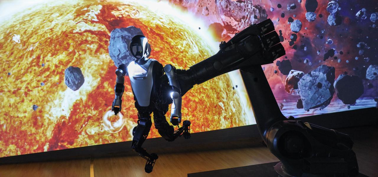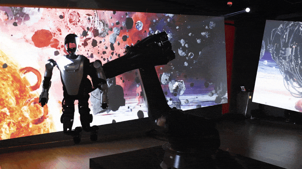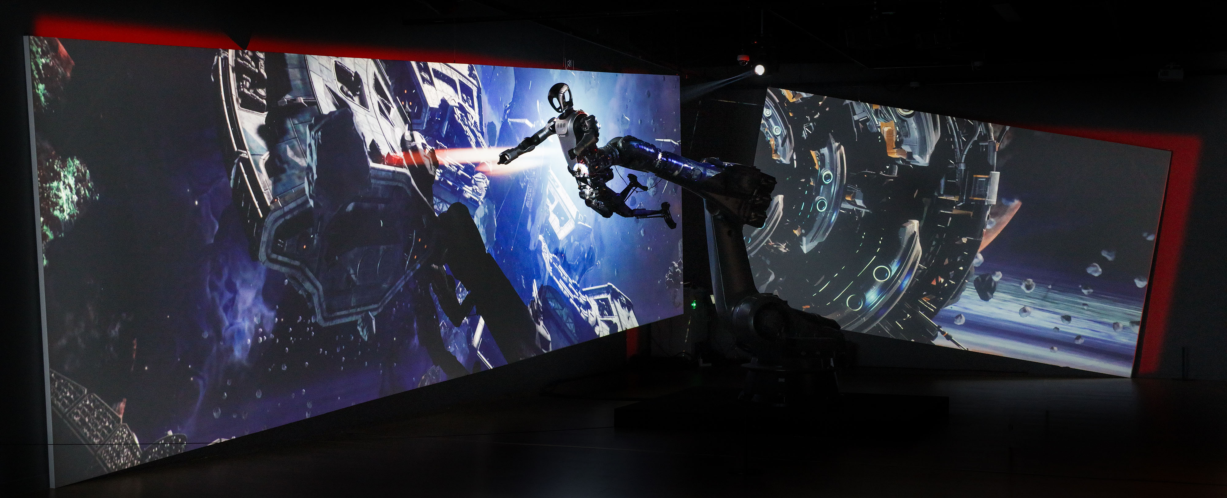 Visually, the work presents a "kinetic umbilical." A massive industrial robotic arm acts as an infrastructure layer, suspending a life-size humanoid robot in mid-air.Using active admittance control, the industrial arm provides buoyancy-like support, canceling gravity to simulate the physics of an extravehicular spacewalk. The humanoid is not a puppet but an agent; it floats in a microgravity drift, oriented not toward the audience, but toward a projection of the "invisual" hazard of space debris.
