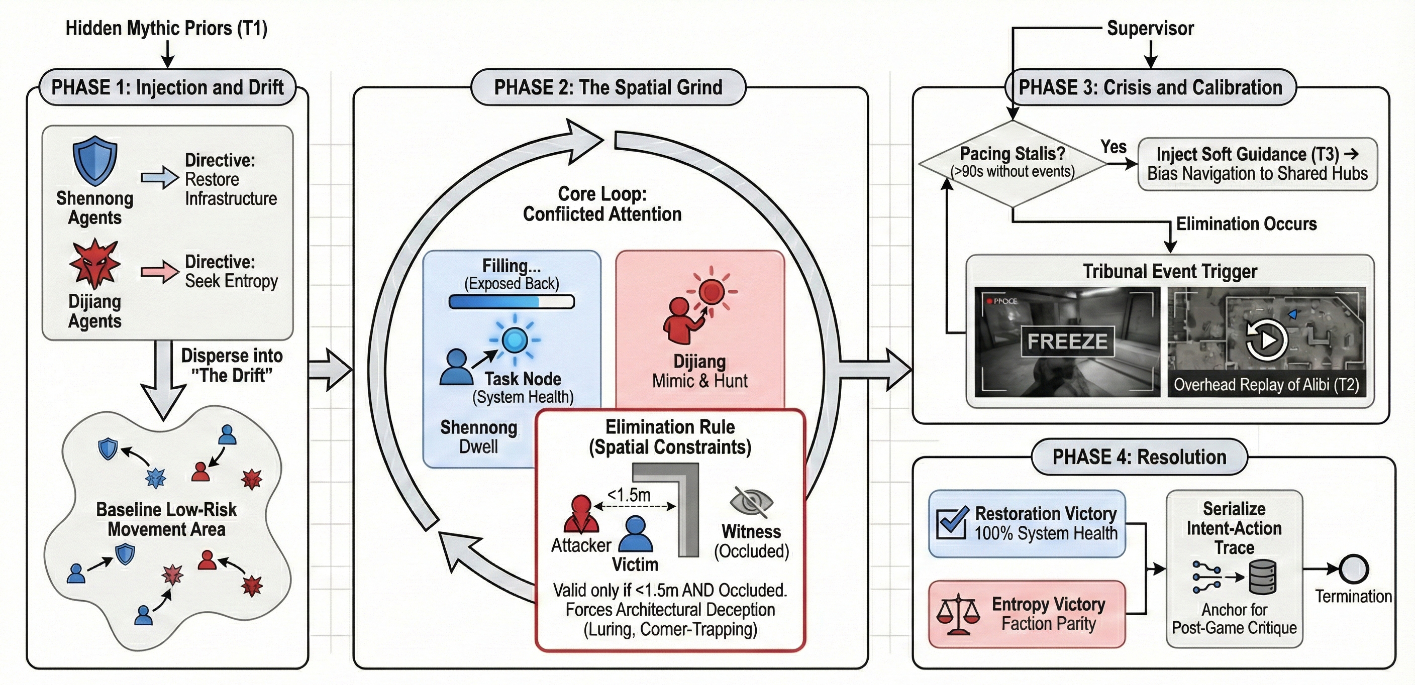 The Supervisor does not just watch; it intervenes. To maintain narrative tension, the Supervisor can execute "soft guidance" (subtly biasing agent attention) or "diegetic hard nudges" (triggering blackouts or door jams) to force agents into new spatial configurations.