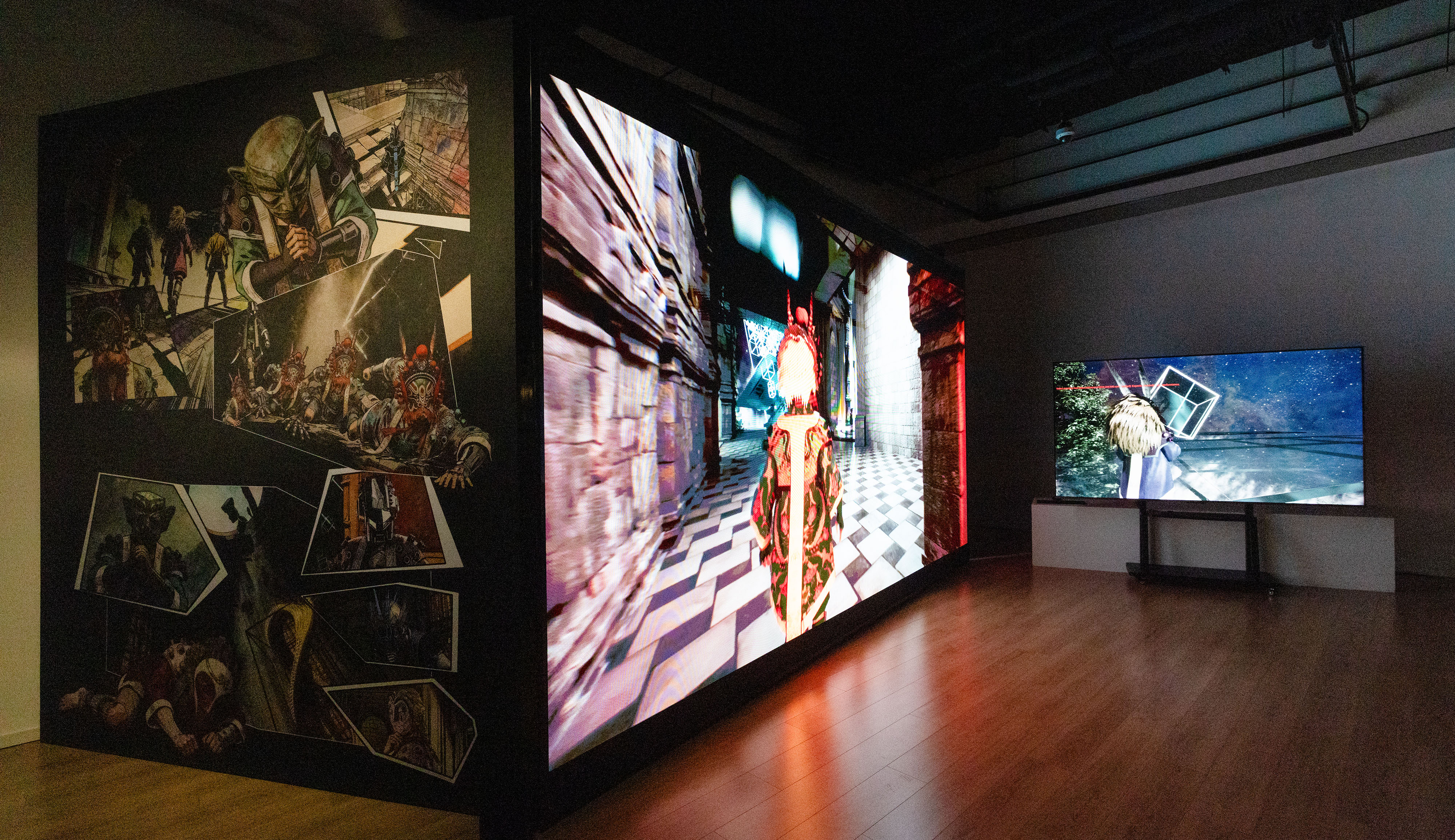 The installation surrounds the audience with four synchronized projection screens, offering a panoramic view of a shared Unreal Engine arena. The environment is a "Time Maze"—a singular architectural geometry rendered through four distinct temporal aesthetics: